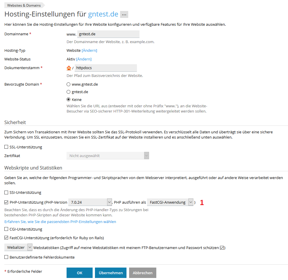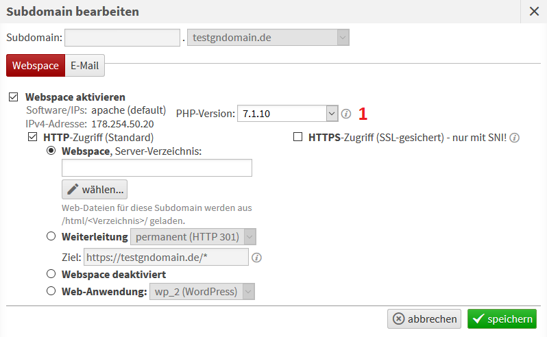 Hier können Sie nach dem Klick auf eine Domain die gewünschte PHP-Version über ein Dropdown Feld ändern (1) und mit dem unteren Button "speichern" bestätigen: